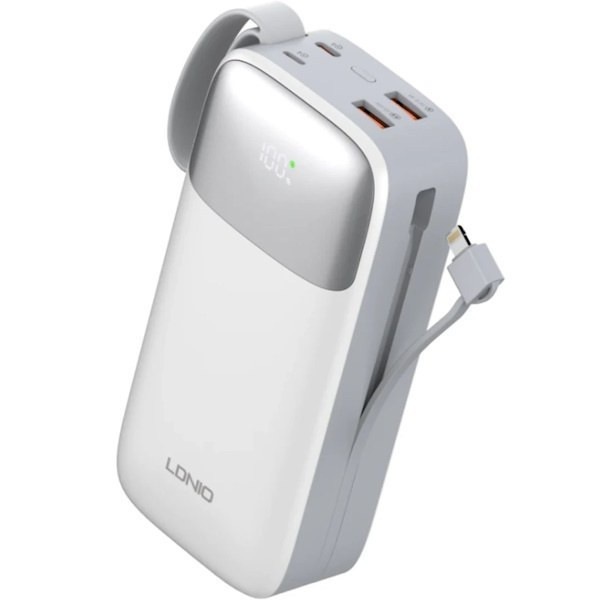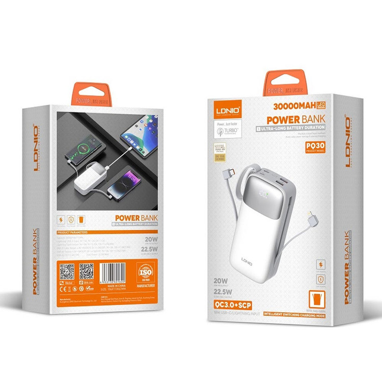 کمپانی LDNIO در دنیای لوازم جانبی کاملا شناخته شده است و شهرت این برند ، در کیفیت ساخت بسیار بالا و همچنین مجهز بودن به تکنولوژی و امکانات روز است. تمامی محوصلات این برند در فروشگاه های معتبر سراسر دنیا اهم از آمریکا و اروپا و … به فروش می رسد و محصولات متعددی ازین برند در سایت آمازون نیز به چشم می خورد. پاوربانک 30000 میلی آمپر الدینیو PQ30 یک هیولای قدرتمند و به شدت حرفه ایست! از ظاهر محصول به راحتی می توان به قدرت و کارآیی بی عیب و نقص این محصول ، پی برد. در بالای پاوربانک LDNIO Pq30 ، چهار درگاه جای گرفته است؛ 2 درگاه USB و 2 درگاه تایپ سی PD. همچنین ، به بدنه 2 نوع کابل Lightning و Type-C متصل است تا کاربر را از به همراه داشتن کابل های متعدد بی نیاز سازد. بر روی پنل جلویی ، 1 نمایشگر LCD نمایش عددی/درصدی میزان شارژ قرار دارد. خروجی پاوربانک در حدود 22.5 وات است که برا شارژ نمودن انواع موبایل ، تبلت ، ساعت هوشمند و … ایده آل است. تمامی درگاه ها از تکنولوژی Fast Charge QC3.0 پشتیبانی می کنند و مجهز به فناوری AudoID هستند. قابلیت AutoID می تواند بصورت هوشمند خروجی خود را کم و یا زیاد تا متناسب به دستگاهی که به پاوربانک متصل می گردد ، شارژدهی کند. این فرآیند منجر به بهینه شدت مدت زمان شارژ ، بهبود کیفیت شارژدهی و همچنین افزایش طول عمر باتری می گردد. این محصول ، به تمامی استانداردهای به روز کمپانی LDNIO مجهز گردیده است.